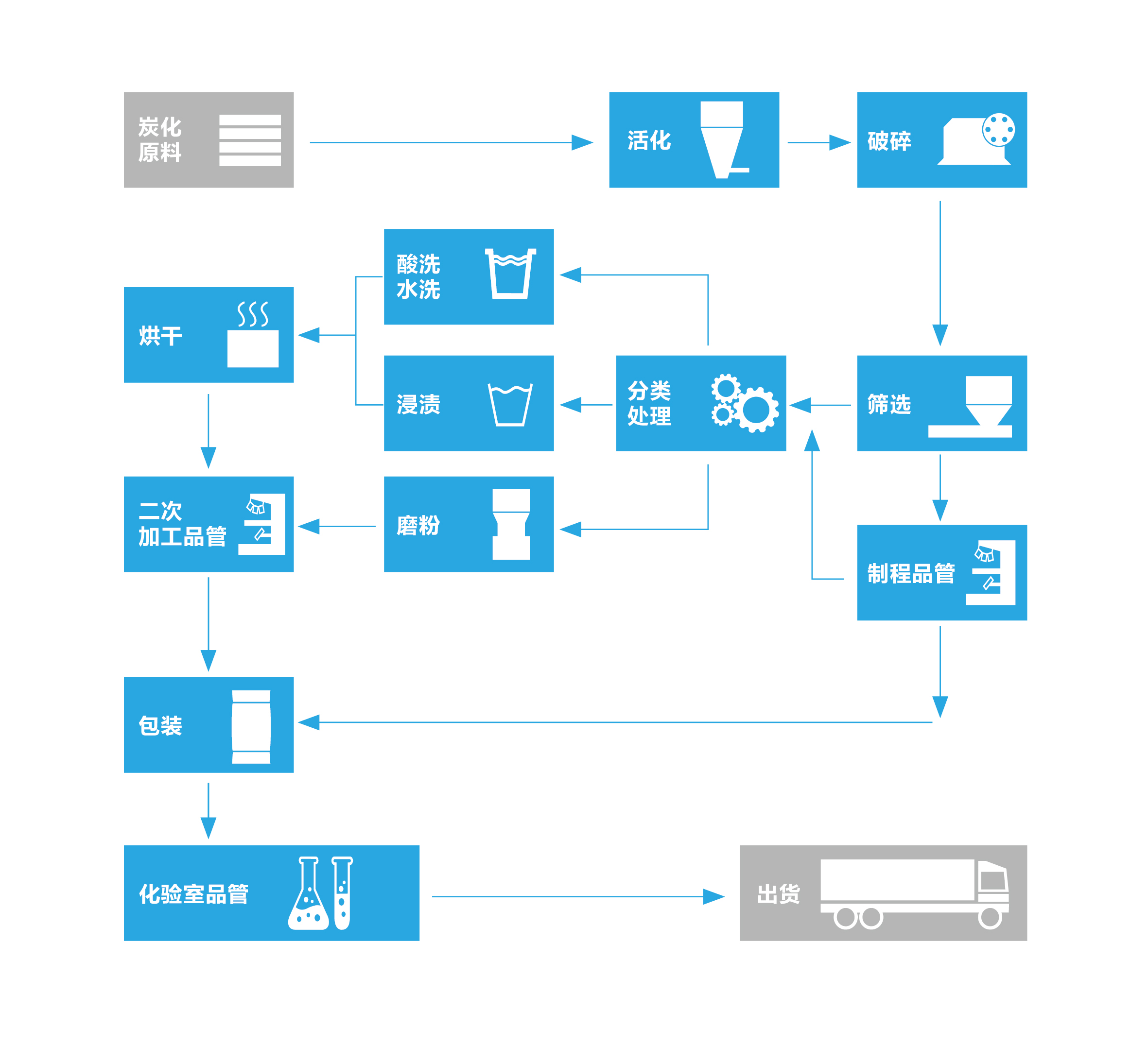 活性炭生產(chǎn)方法有兩種,化學活化法和物理活化法。 化學活化法就是通過將各種含碳原料與化學藥品均勻地混合后,一定溫度下,經(jīng)歷炭化、活化、回收化學藥品、漂洗、烘干等過程制備活性炭。 物理法通常又稱氣體活化法,是將已炭化處理的原料在800 ~1000℃的高溫下與水蒸氣,煙道氣(水蒸氣、CO2、N2等的混合氣)、CO或空氣等活化氣體接觸,從而進行活化反應的過程。